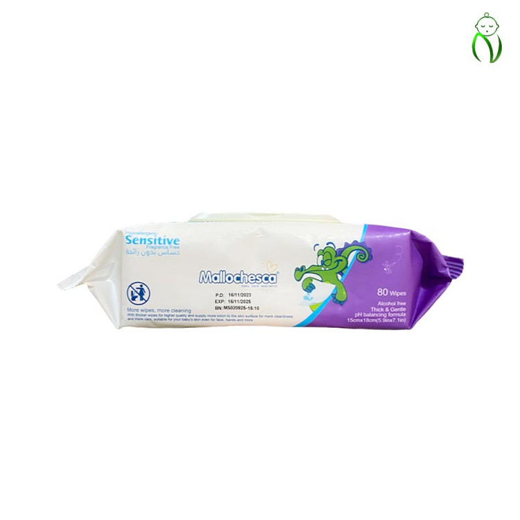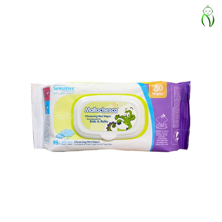 دستمال مرطوب مالوچسکا بدون عطر و بو ، فاقد الکل و 98 درصد بر پایه آب تهیه شده ، تعداد 80 برگ مناسب از بدو تولد